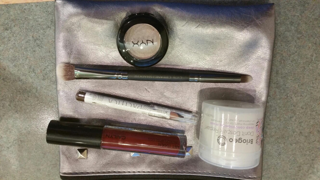 Now here is the bag with all its goodies. Inside I found a NYX eyeshadow in Chandelier (Now I’m singing Sia – go ahead click the link I’ll wait until you listen too), Pacifica eyeliner in Fringe (which is like a brown color). This I may use as a lip liner, brow liner. Caiylin tinted lip gloss in Love Affair – rich red color, really nice. Briogeo Don’t Dispair, Repair! Deep conditioning mask for my hair (woot!) It’s a small container which I’m hoping will cover my mass of hair at least once LOL. And finally …. from Crownbrush.com, a crease/shadow brush for eyeshadow. The bristles on this are incredibly soft.